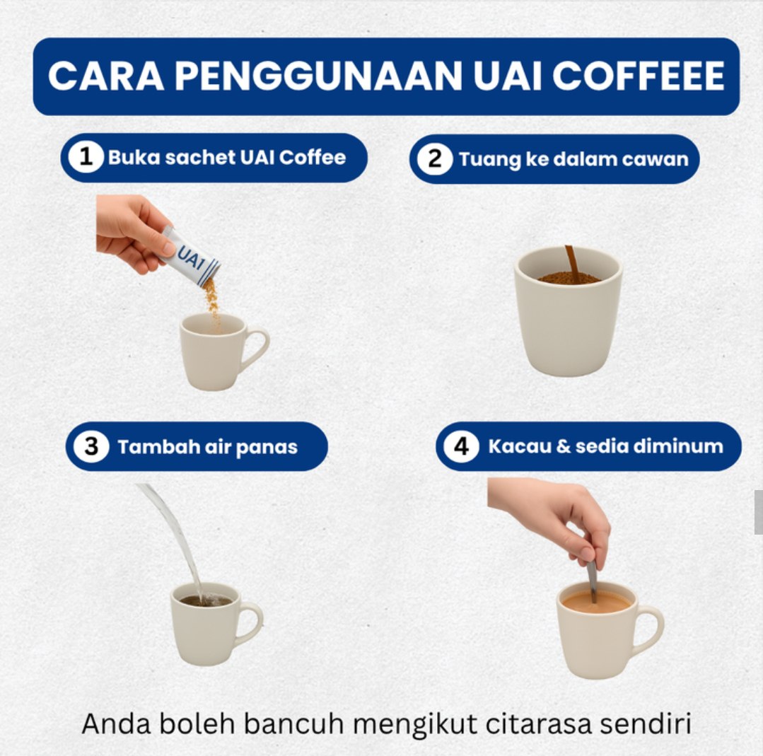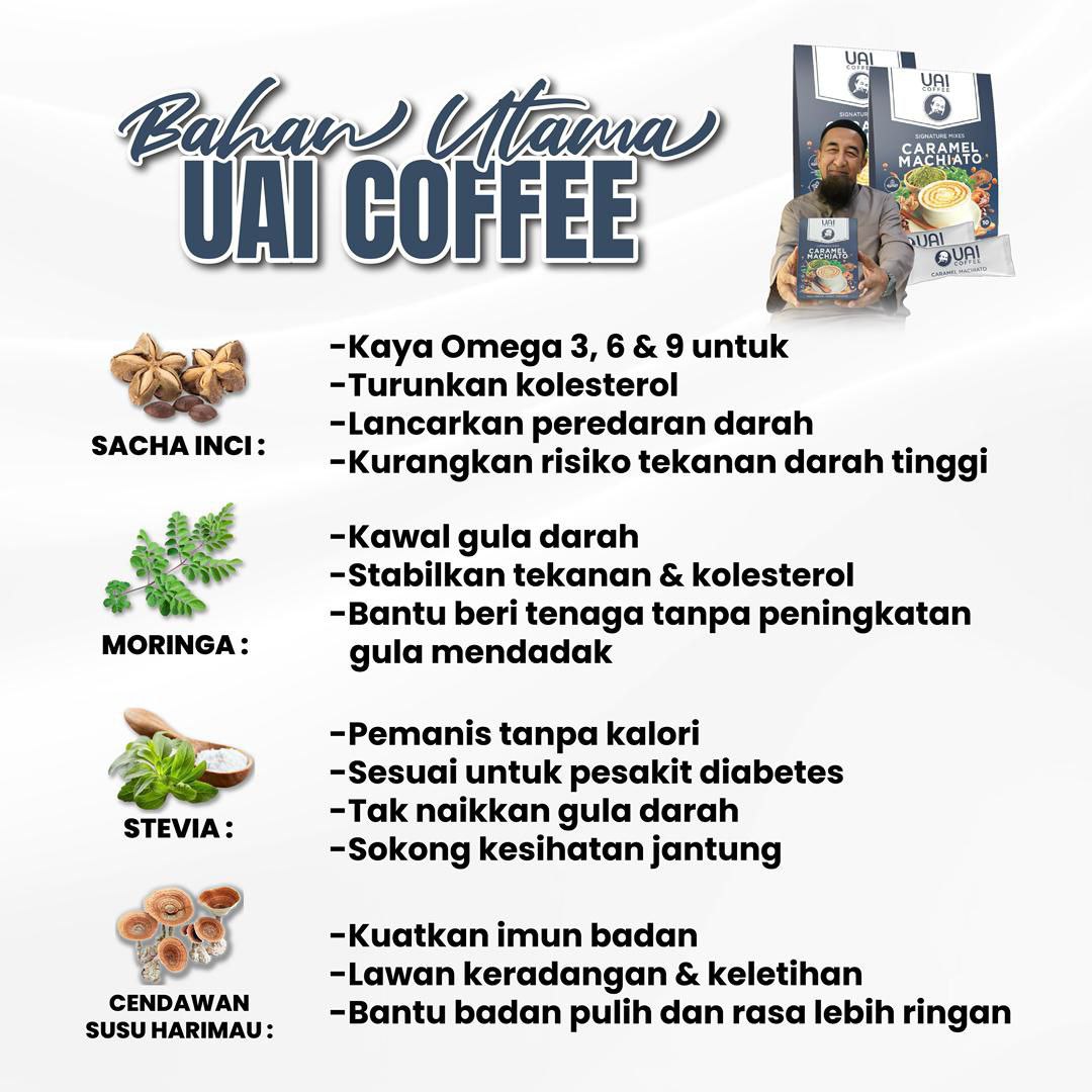 UAI Coffee dibuat daripada bahan aktif seperti Moringa, Sacha Inchi, dan White Tiger Mushroom, yang bantu kawal tenaga, gula, dan saraf secara semula jadi.